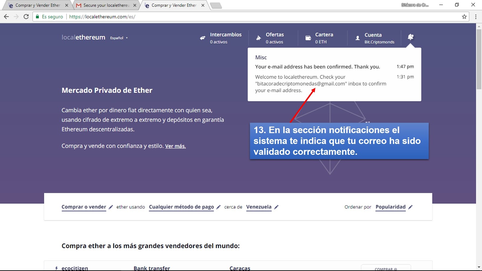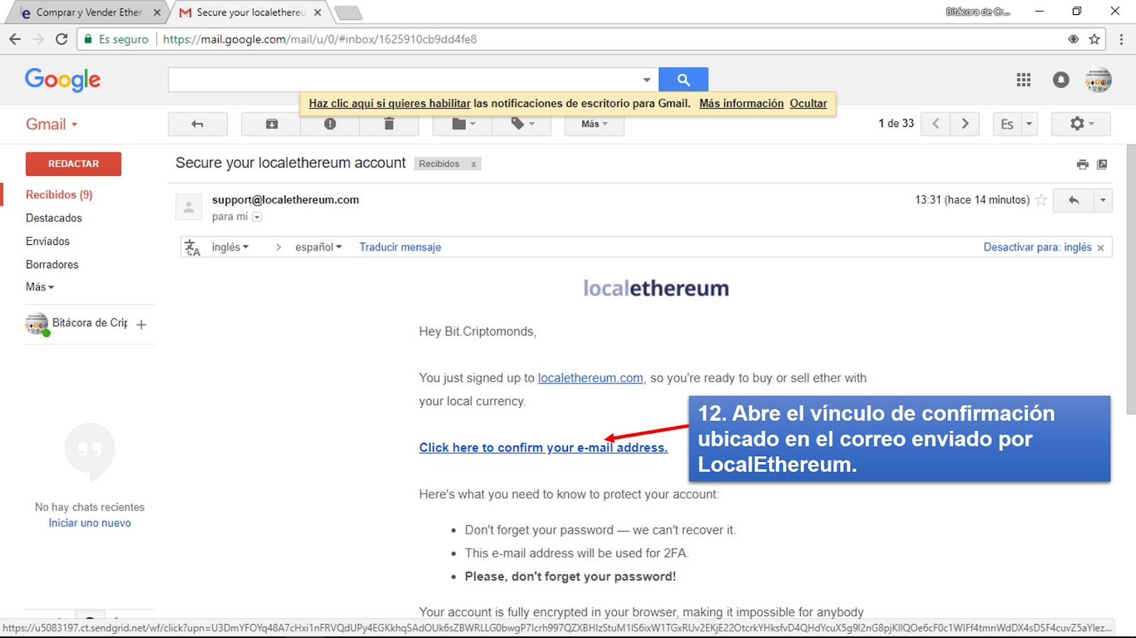 6) En la Bandeja de Entrada de tu proveedor encontraras un correo enviado por support@localethereum.com, abrelo y haz clic sobre el vinculo de confirmación adjunto en el cuerpo del mismo (Figura 8). Posteriormente, en la sección notificaciones el sistema te indica que tu correo ha sido validado correctamente.
