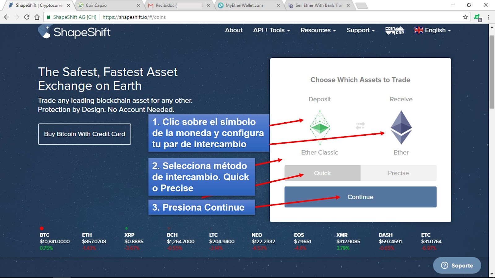 1) Abrir la pagina de la Plataforma ShapeShift. En la Figura 1 se muestra el diseño del sistema el cual es bastante intuitivo. Primero se debe configurar el par de intercambio, en este caso se quiere cambiar ETC (Deposit) por ETH (Receive), para ello se hace clic sobre sobre el símbolo de la moneda y se selecciona de lista desplegable que muestra la página. En segundo lugar, se selecciona el método de intercambio, por defecto Quick (más adelante se describirá su diferencia con Precise). Por ultimo, se presiona Continue para dar inicio al intercambio.