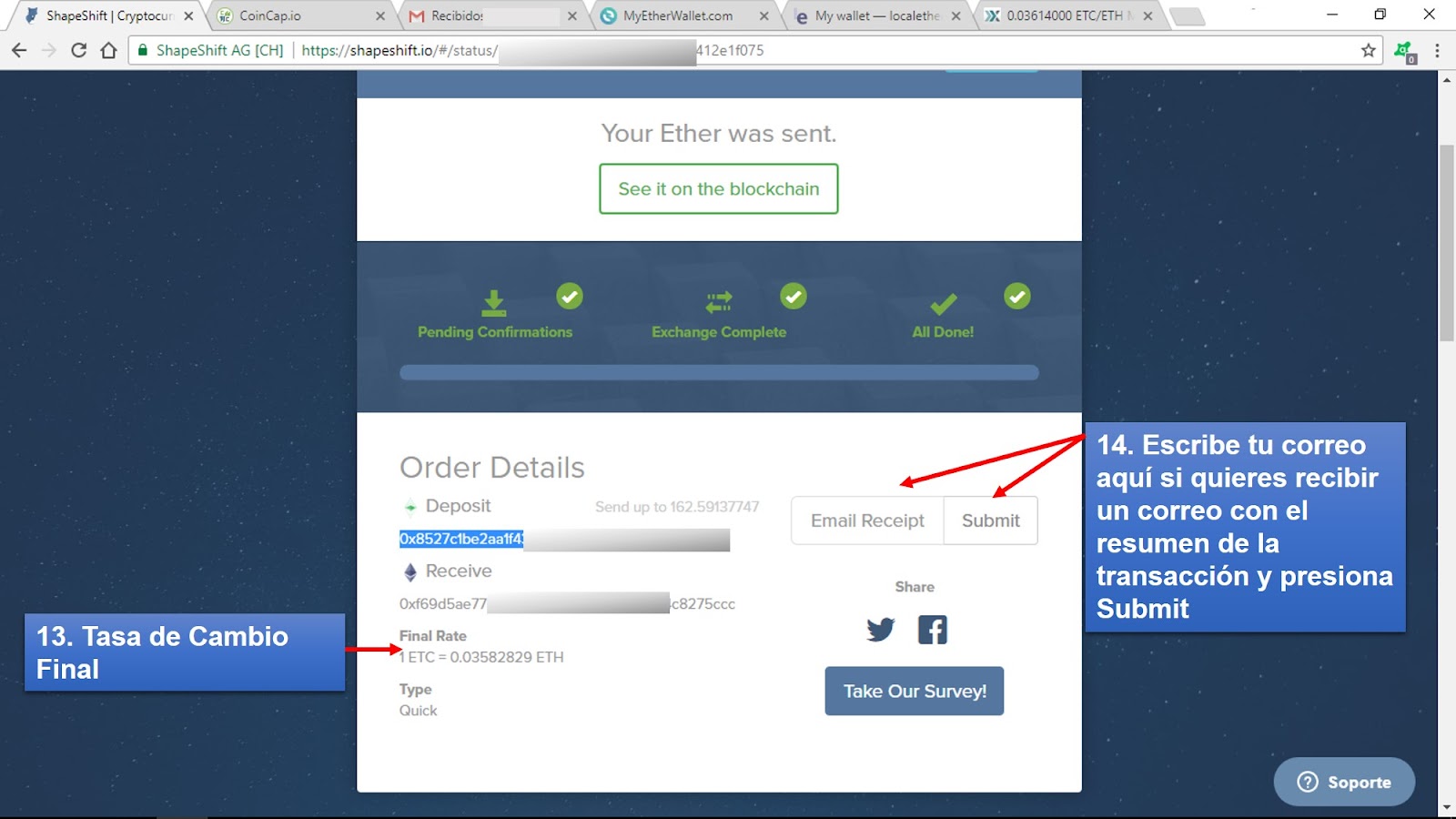 Finalizado el intercambio los Fondo son enviados de forma automatica a la dirección de destino. Si se requiere un recibo por la operación, se debe escribir un correo en el cuadro de texto que indica Email Receipt y presionar Submit (Figura 5).