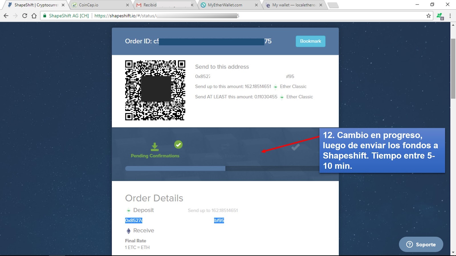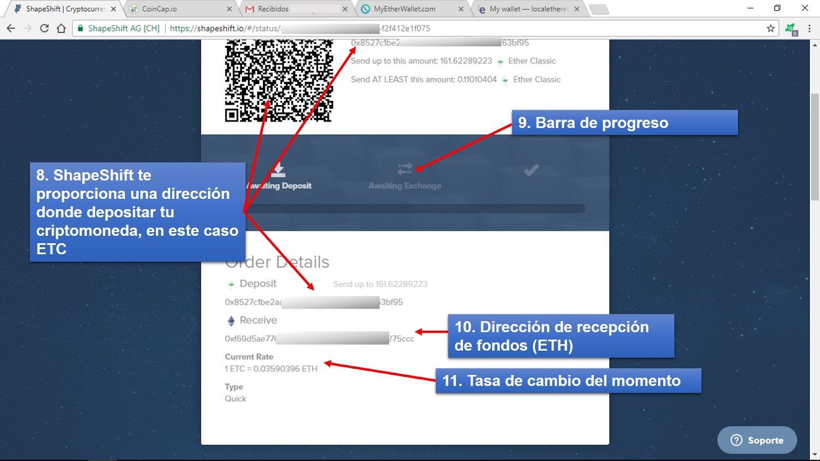 Este manual utiliza como ejemplo el intercambio de Ether Classic (ETC) por Ether (ETH). Para la transferencia de ETC a ShapeShift se empleó el servicio de MyEtherWallet y la dirección de recepción de ETH es de la plataforma LocalEthereum.