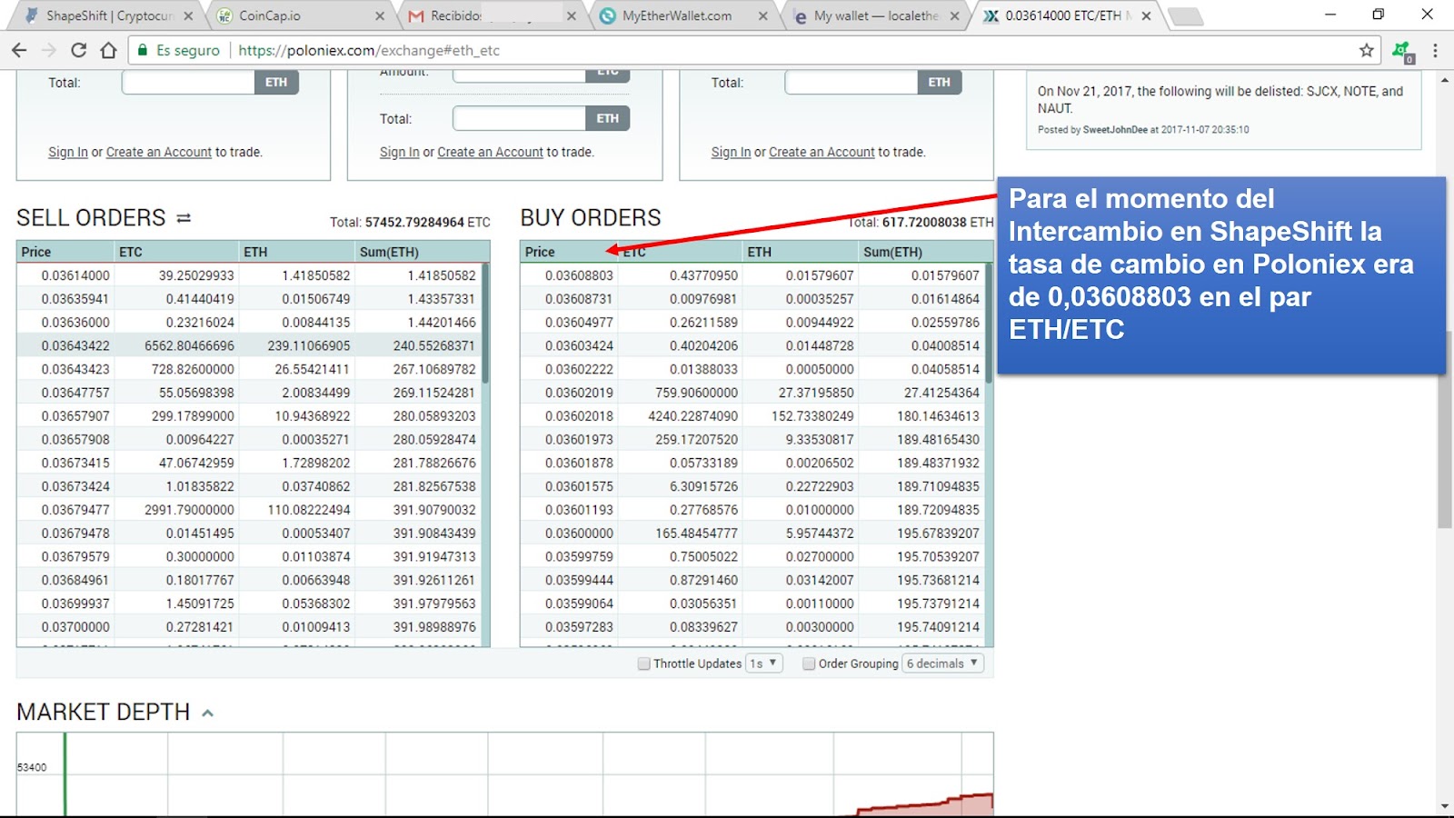 Para terminar nuestro artículo queremos mostrarle a lector una comparación entre la tasa de cambio (Final Rate) obtenida con ShapeShift con la tasa reportada por un Exchange de gran volumen como lo es Poloniex. En la Figura 6, se presenta una imagen del Libro de Ordenes del Exchange Poloniex para el Par ETH/ETC segundos después de haber concluido el intercambio en ShapeShift, con este se obtuvo una tasa de cambio equivalente a 0,03582829 ETH/ETC mientras que en Poloniex se mostraba una tasa de 0,03608803, la cual es superior en 0,73% a la obtenida por ShapeShift. Sin embargo, se debe tener presente que Poloniex, al igual que la mayoría de las casas de cambio cobran una comisión entre 0,15-0,25% más una comisión por el retiro de fondos de sus plataformas (en el caso de Poloniex para procesar el retiro de ETH la comisión es fija e igual 0,01 ETH).